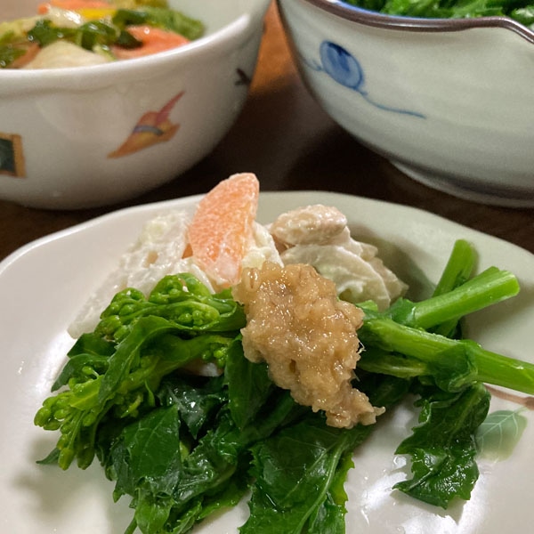 塩ゆでした菜の花に、”生姜みそ”を添えてはいかがでしょう。
