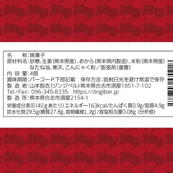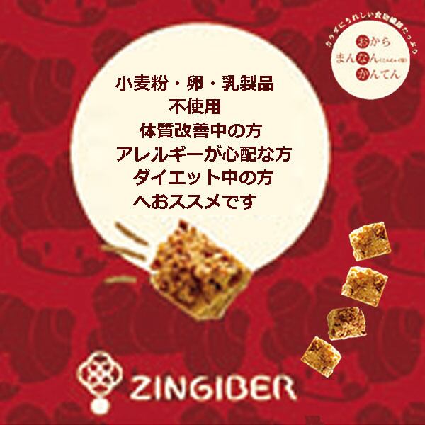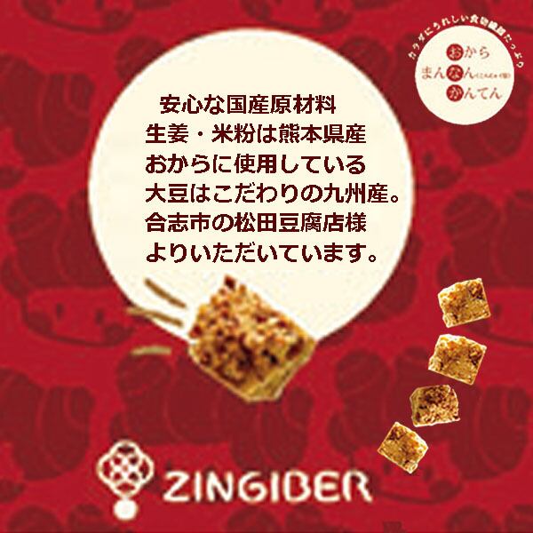 原材料:生姜、砂糖、米粉、なたね油、おから、寒天、こんにゃく粉、膨張剤(重曹)